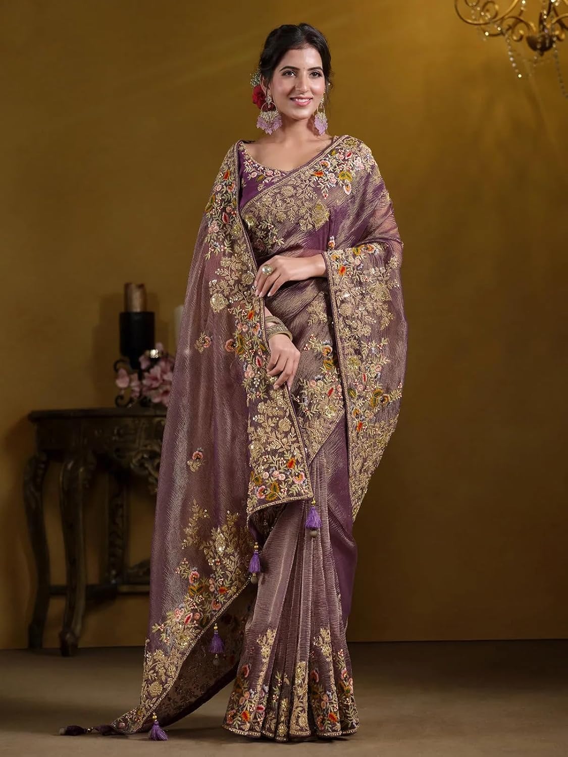 Purple Silk Saree with Embroidery Borders and Pallu Designs