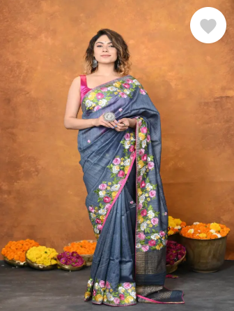 Embroidered Handloom Tussar Silk Saree (Grey)