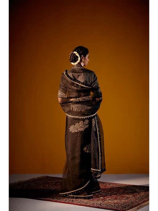 Black Organza Printed Saree And Stripe Tissue Embroidered Blouse