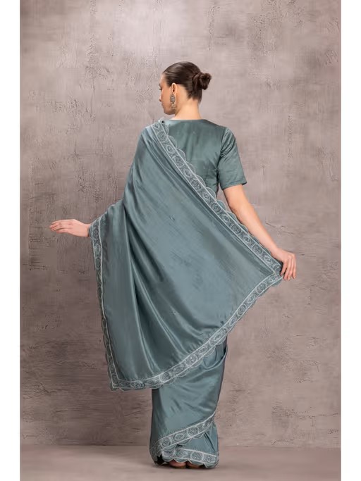 A Sky Blue Pure Silk Saree with Cutwork, Full Handwork Using Resham and Sequins Is A Stunning Choice That Exudes Elegance and Sophistication. The Sky-Blue Colour Adds A Soft and Serene Touch, While The Cutwork Detailing Enhances Its Beauty with Intricate Patterns and Designs. The Full Handwork Using Resham (Colourful Silk Threads) and Sequins Adds A Touch Of Glamour and Sparkle To The Saree, Creating A Captivating Visual Appeal A Satin Silk Blouse Full Hand Work Detailing Of Edges.