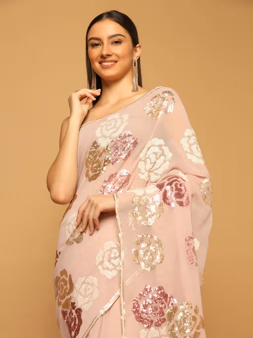 Pink Floral Sequins Embroidered Saree