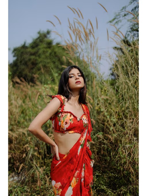 The Red Floral Printed Ruffle Saree Feature Beautiful Georgette Ruffled Layers Of The Saree Which Adds Volume and Movement. The Saree Is Paired with A Matching Floral Print Blouse with Cowrie Tassel On Shoulder Strap and On Back .