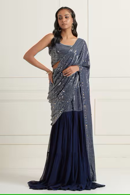 Sequin hand embroidery on saree pallu, Back deep U neck on blouse, Layered design for added volume