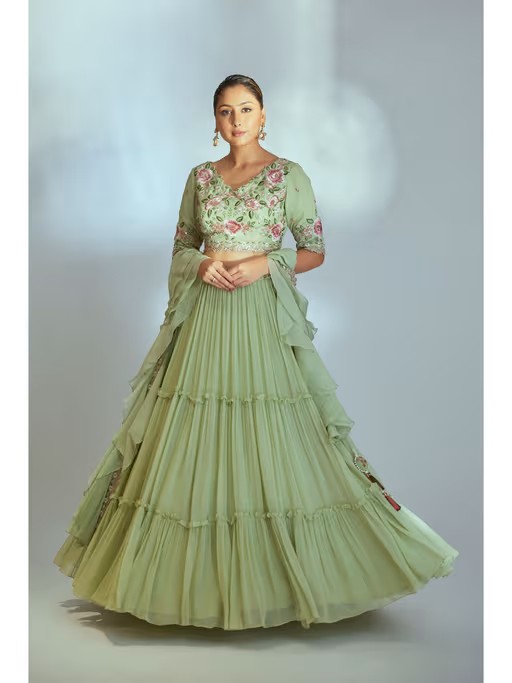 Adorn the styles specially made for you with this green set from Suruchi Parakh. Made from high quality georgette, it features hook and eye closure and embroidered pattern along with half sleeves & v-neck design. Pair it with trendy footwear to elevate your look.