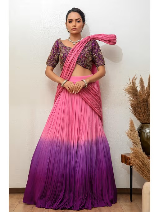 Dress up in elegant way with this purple lehenga, blouse from Daatri by meenakshi kakkar. Made from high quality georgette silk, it features hook and eye closure and embroidered pattern along with half sleeves & v-neck design. Pair it with sneakers to complete your ensemble.