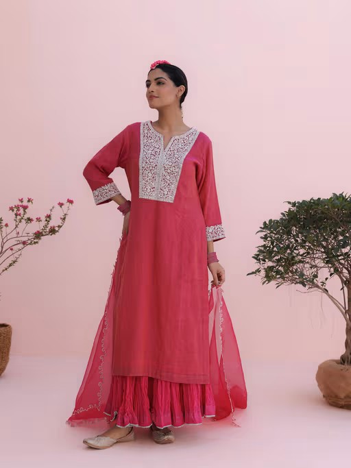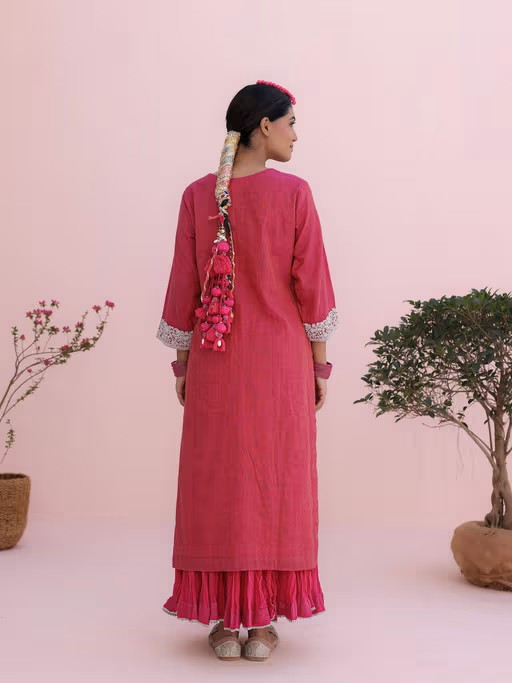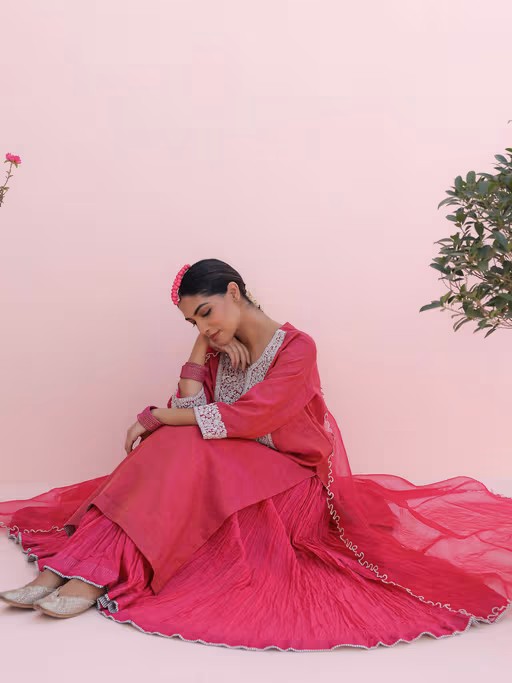 Our Classic Rani Pink Long Kurta with A Crushed Skirt Is Designed In Thread work, A Beautiful ‘Jaal’ Styled with Sequence Work In Between and A Knotted Dupatta.