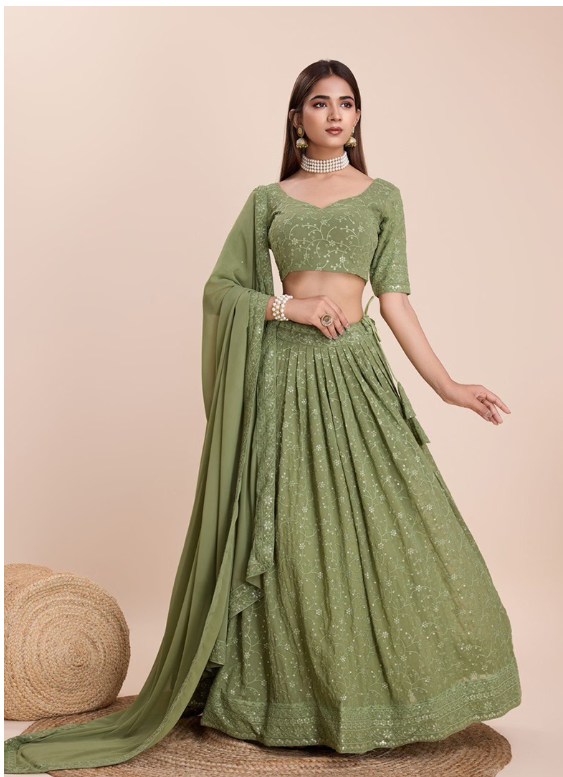 Step into elegance with this stunning Green Sequin Thread Embroidered Faux Georgette Lehenga Set, designed to turn heads at every celebration. A beautiful blend of tradition and trend, it's your perfect pick for any grand event.