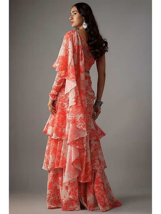Embrace Effortless Grace In This Pre-Draped Pink Georgette Saree. The One-Shoulder Bustier Flatters Your Curves, While The Print From Our Boho Collection Adds A Touch Of Whimsy. Pre-Draped For Your Convenience, This Saree Is Ready To Make You Feel Like A Goddess.