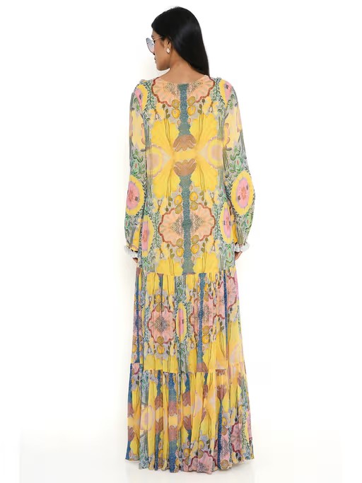 Yellow enchanted print embroidered yoke art georgette boho dress.Disclaimer :- Since we are a made-to-measure brand and our dyeing process and embroidery are handcrafted, there may be slight variations in the color and embroidery of the actual product. The color of the outfit might also slightly vary from what you see on your device's screen.The print placement may also vary from what is represented in the images shown on the product page.