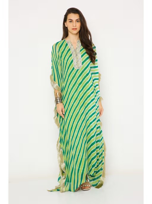 Green Leheriya Georgette Embroidered Yoke Kaftan Hand Embroidered Leheriya Kaftan With Gota Fringes.