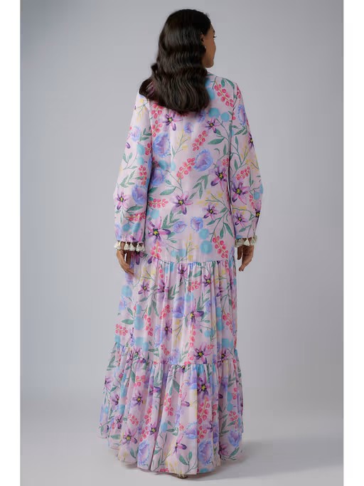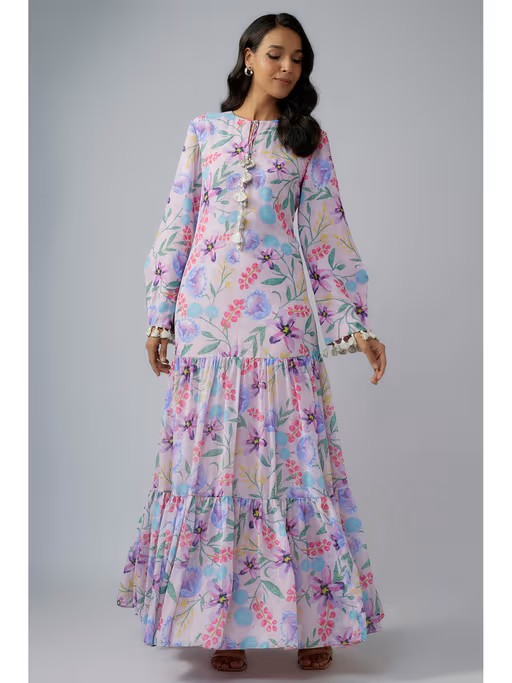 Embrace the style made for you with this pink dress from PS Pret by Payal Singhal. Made from high quality georgette, it features pull on closure and floral pattern along with full sleeves & tie up neck design. Pair it with ballerina or heels to complete your ensemble.