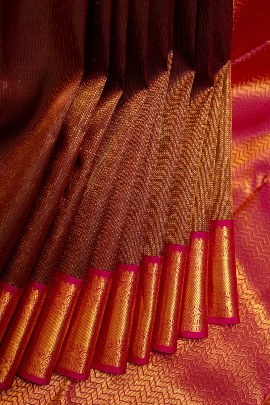 This Maroon Zari Brocade Pure Kanchipuram Silk Saree is the perfect choice for an effortless yet elegant look. Featuring a luxurious traditional design with a magenta korvai border, this saree is ideal for weddings when paired with an embellished blouse. Enjoy a timeless look with this beautiful saree.