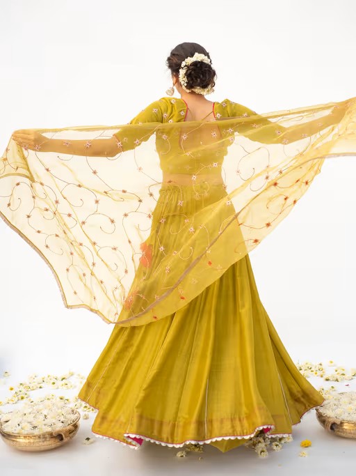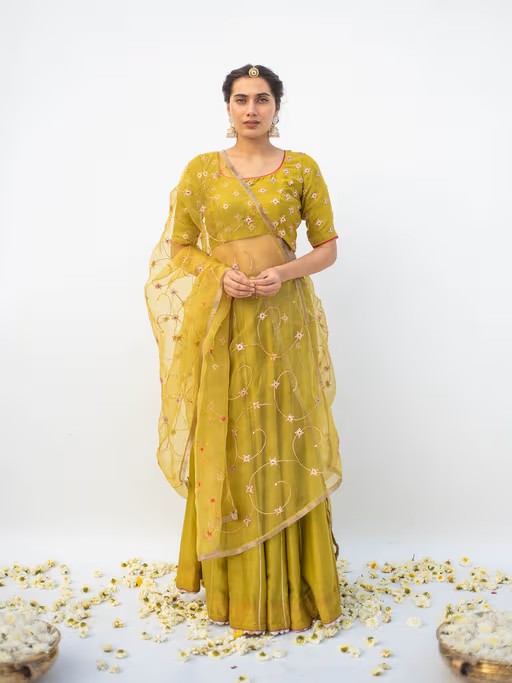 Cotton Silk Lehenga Choli Set Perfect For A Mehedi Function, Embroider with Our Traditional Gota Patti Work.