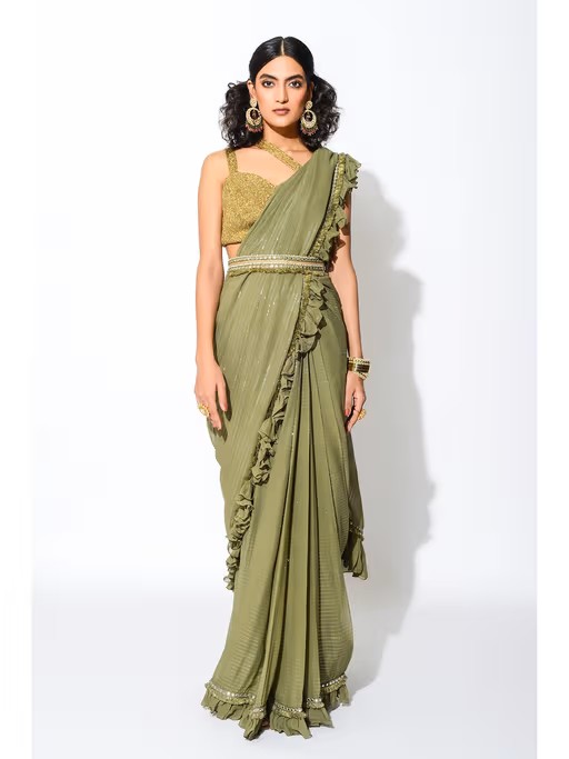 Make a style statement with this olive saree from Rishi & Vibhuti. Crafted from georgette, this exquisite saree comes with a stitched blouse and a belt. Team this saree with a pair of heels and statement jewellery.
