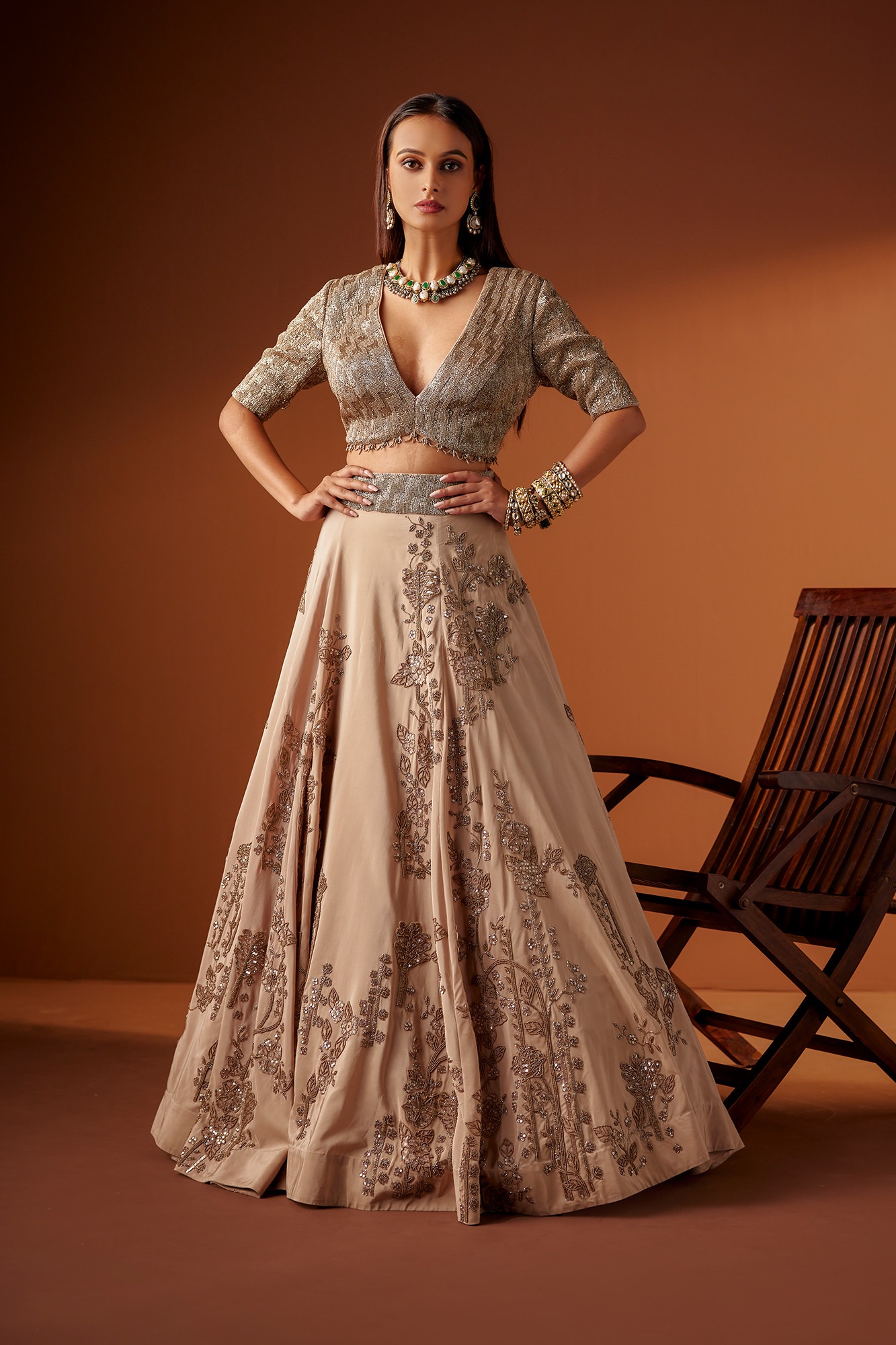 Chir, katdana, sequence and beads monotone embroidered V neckline elbow sleeves blouse with pearl highlighted edges paired along with heavily embroidered lehenga and an organza dupatta with one sided broad cutwork embroidery and three sided narrow embroidery.