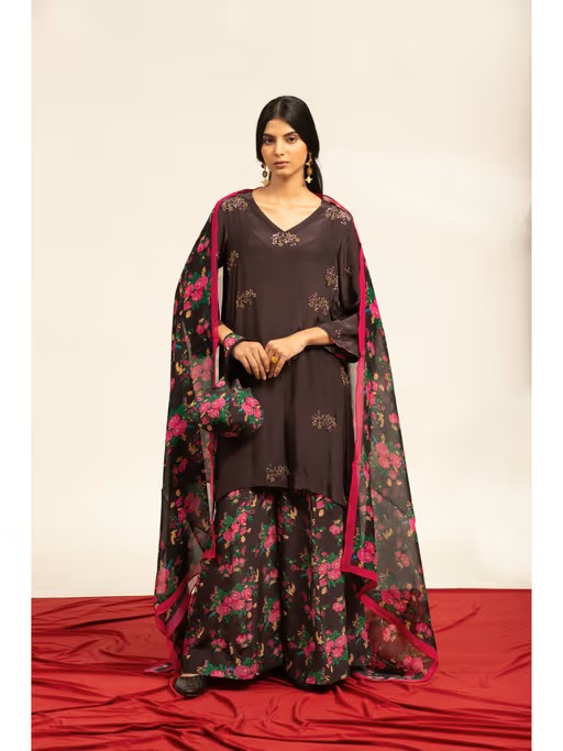 Experience The Perfect Fusion Of Comfort And Style With This Shetab Kazmi Brown Kurta With Sharara Pant & Dupatta. It Is Made From High-Quality Fabric. It Features Full Sleeves, V-Neck Kurta Style And Flared Mid Waist Pant Style. Ideal For Any Occasion, It Is Designed To Flatter With Ease And Sophistication.