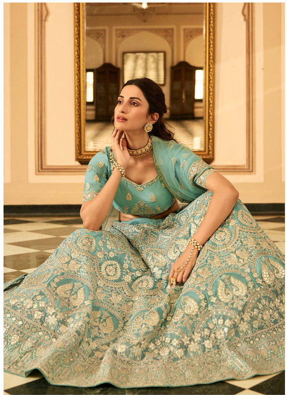 Turquoise Blue Heavy Embroidered Organza Lehenga Set