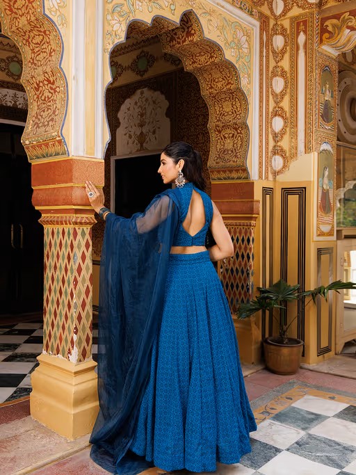 Introducing the Bunting Indigo Blue Chikankari Lehenga Set, a perfect choice for festive and partywear. This elegant teal lehenga set features luxurious georgette fabric adorned with intricate Chikankari embroidery, adding a touch of sophistication. The Blouse is designed with a chic collar neck and sleeveless cut, offering a modern and stylish look. Complemented by a matching organza dupatta, this lehenga set enhances your ensemble with an extra layer of grace. Ideal for celebrations and special events, the Bunting Indigo Blue Lehenga Set combines traditional craftsmanship with contemporary style, ensuring you stand out. Elevate your festive wardrobe with this stunning and versatile lehenga set.