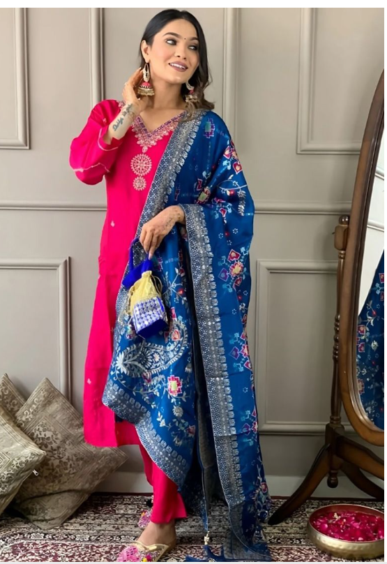 Pink Embroidered Chanderi Viscose Kurta Set