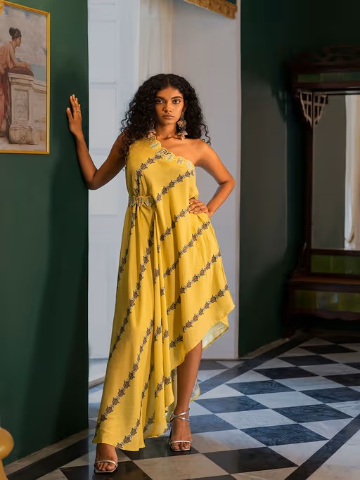 Yellow Evil Eye Print One Shoulder Evil Eye Asymmetric Cut Dress(Half Side Belt Show) with Evil Eye Belt