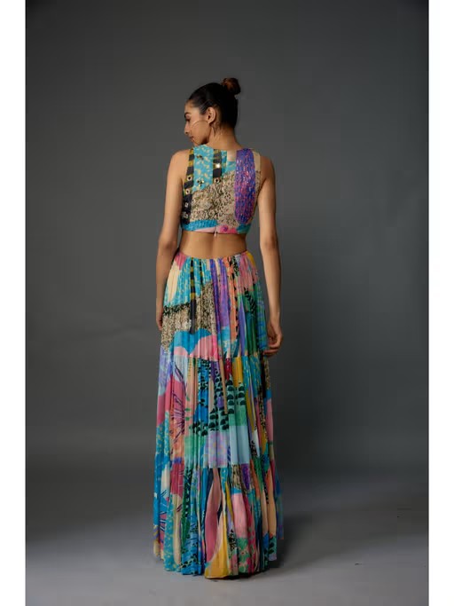 Embrace elegance by stepping out in this captivating aqua tropical print art georgette embellished cut-out dress from PS Pret by Payal Singhal. Made from high-quality georgette, this piece features a sleeveless design and a v-neck. Style it with minimal jewellery and sandals to complete the ensemble.
