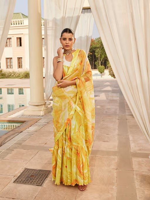 Summer dressing is made easy with this yellow dress sari that comes with a dupatta and a dress. Elevated with hand moti embroidery in organza and pleated linen satin fabrics, the attire has a festive outlook all over!