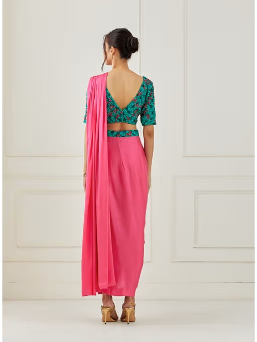 Pink Draped Saree with Sleeves Saree with Stitched Blouse