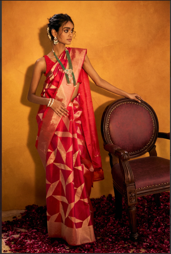 The lightweight organza fabric allows for an elegant, effortless drape, ensuring comfort without compromising on luxury. Perfect for a bride’s trousseau or a festive celebration, this saree embodies grace and femininity.