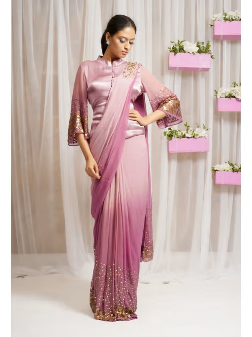 Elevate your look with this pink hand embroidered saree and stitched blouse set from FS Closet by Farha Syed. Crafted from blended fabric, the blouse is finished with bell sleeves and mandarin neck. Style this set with a pair of heels and statement jewellery to complete the look.
