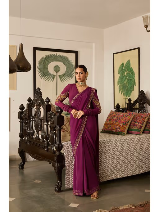 Purple Embroidered Crepe Saree with Hand Embroidered Blouse