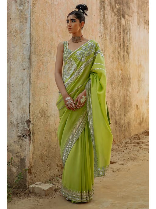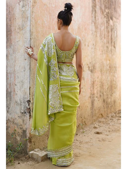 Green saree in chanderi with patchwork and hand embroidery. Handwoven Chanderi (cotton silk). It is adorned with intricate patchwork and hand embroidery in silver on 2.25m of pallu. Hand embroidered border in metallic silver. The edge of the pallu is adorned with 3D cut flowers in silver. This comes with matching plain unstitched blouse piece in chanderi (cotton silk). The blouse in the image is for styling purpose only and can be purchased separately. Saree Length: 5.5m , Blouse Fabric: 1m