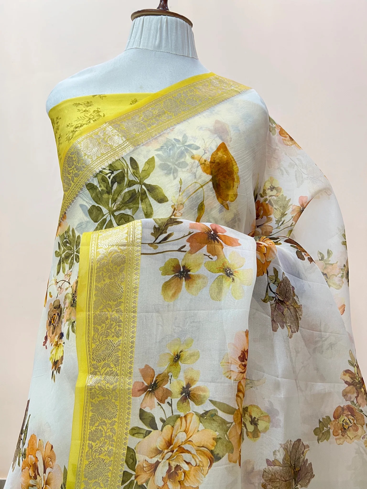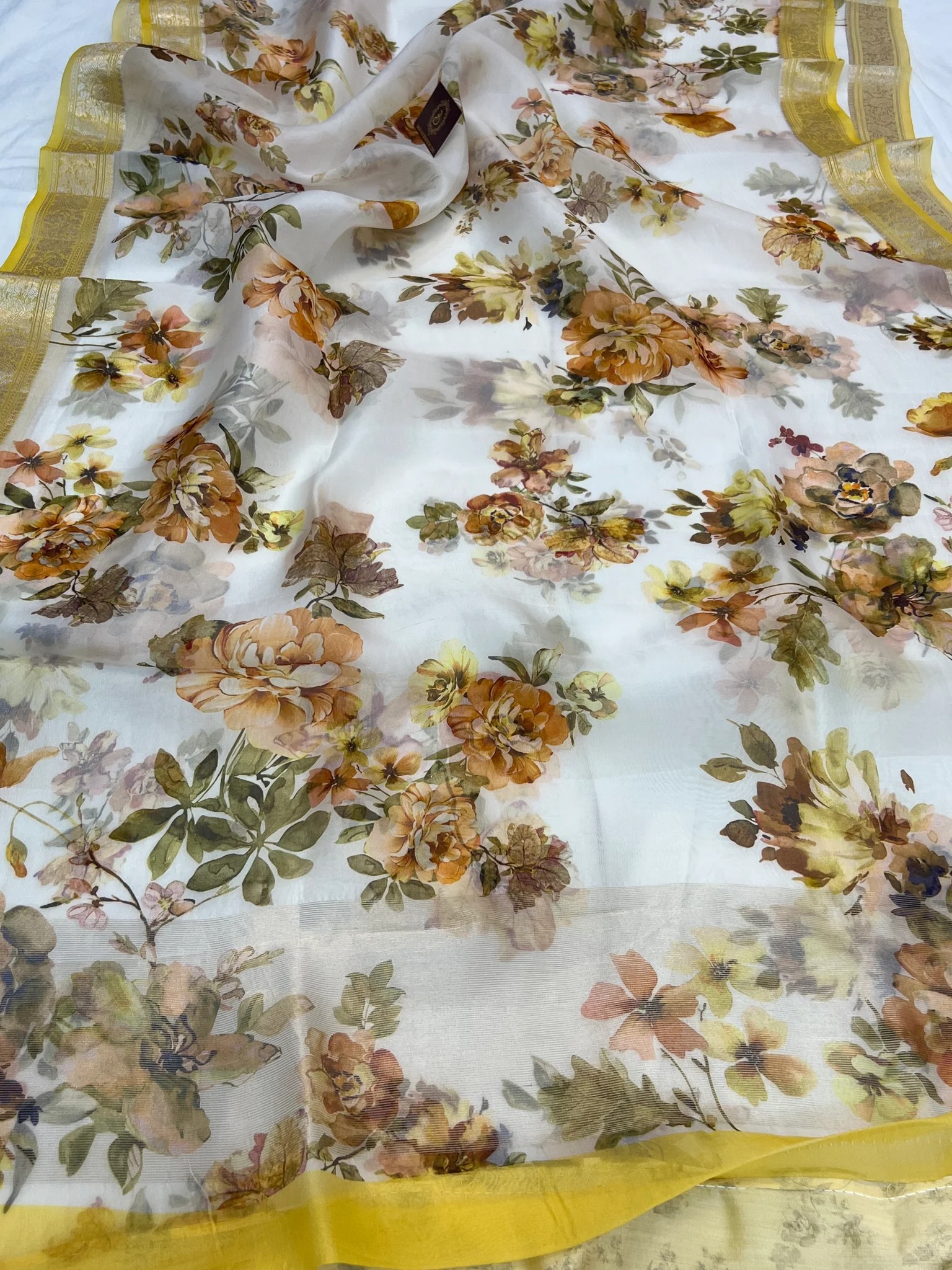 White Pure Kora Silk Handloom Banarasi Saree with Digital print