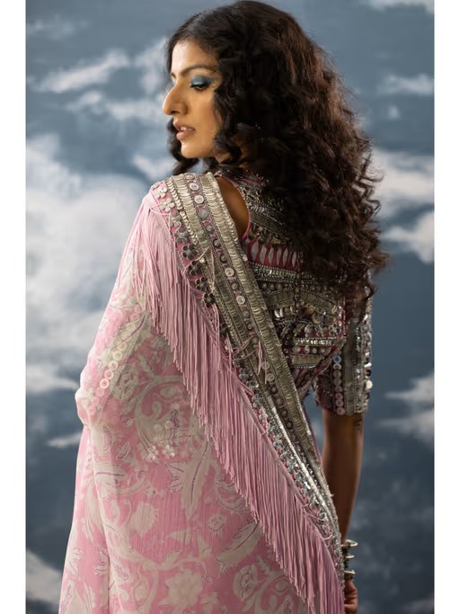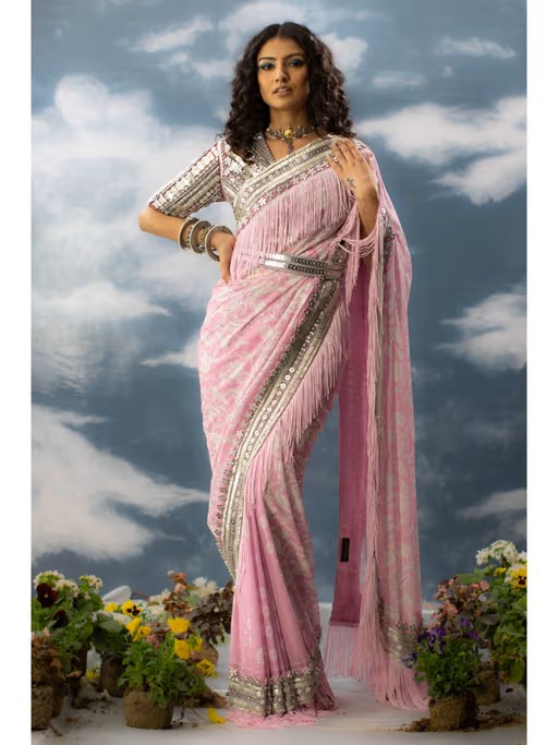 Lilac Pink Printed & Embroidered Saree in Chiffon -Handcrafted in Chiffon -Handpainted motifs printed on a chiffon -Hand embroidered border in metallic silver and adorned with fringes -Comes with unstitched unembroidered matching solid blue blouse piece in chanderi with hand embroidred border -The Blouse in the picture is for styling purpose only and can be purchased only.
