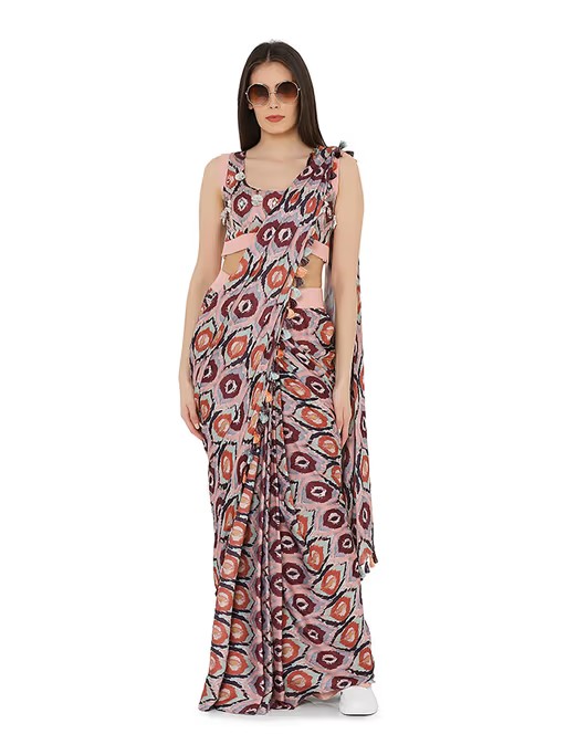 When an aesthetically pleasing silhouette meets a unique design, a power packed look is guaranteed. This exquisite red saree from PS Pret by Payal Singhal is sure to create the right amount of drama. Crafted in rich quality viscose, this artfully printed piece has been accented with attractive tassels and detailing at the rib to create a mesmerising outfit. The attached blouse piece features a round neck and the sleeveless design ensure you stay breezy and comfy all day long. Club with a pair of chandbali earrings to look your ethnic best.