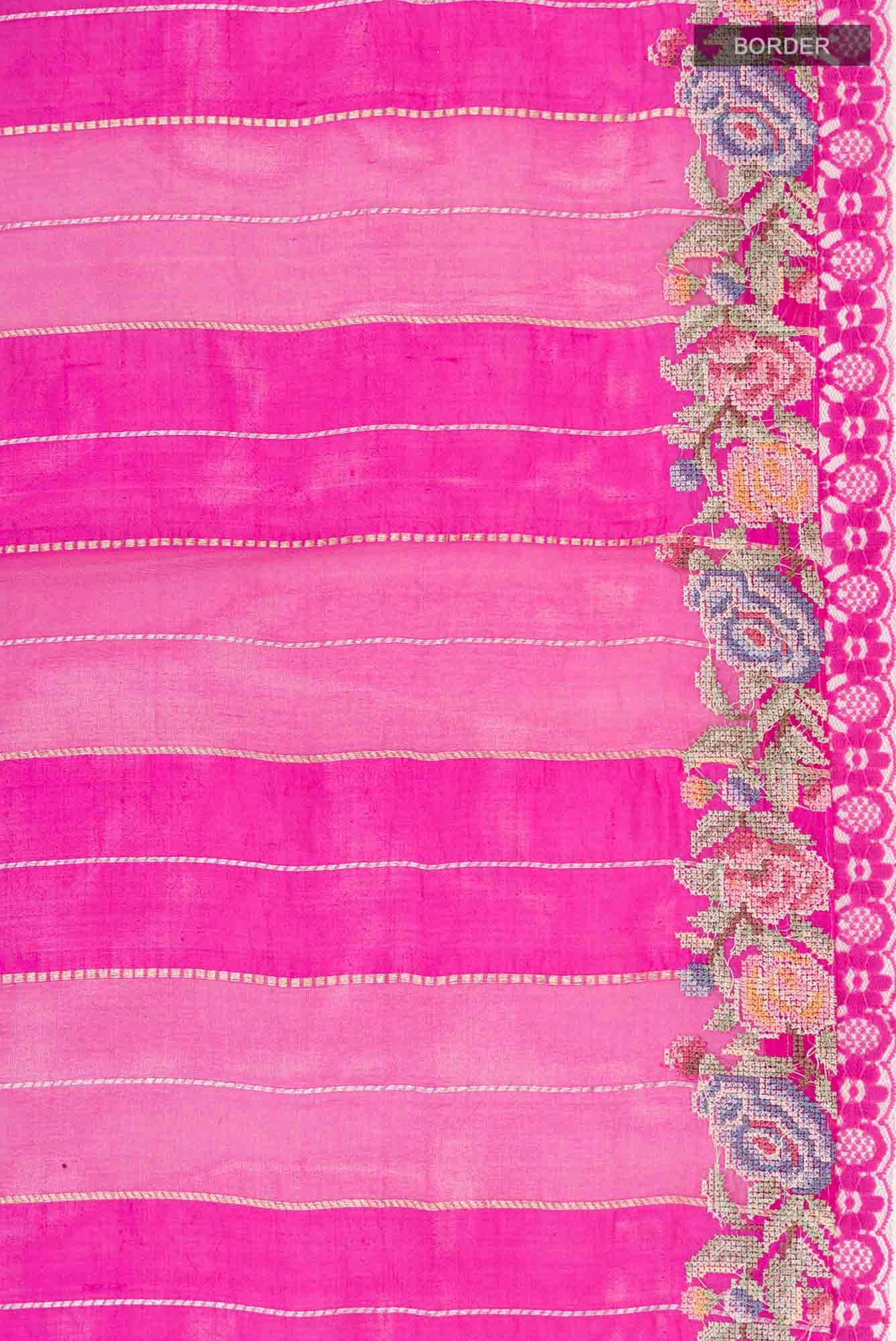 Pink Organza Silk Saree with Zari Butta on the body and Embroidery Border. Includes unstitched blouse.
