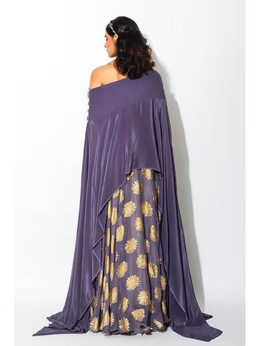 Make a style statement with this purple set from Rishi & Vibhuti. Crafted from georgette, it is finished with a sleeveless design and one shoulder silhouette. Team this set with a pair of heels and statement jewellery.
