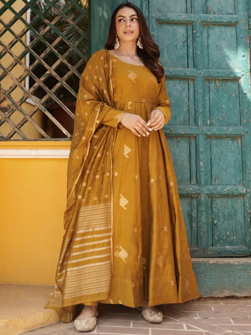 Our 3-piece mustard yellow embroidered Chanderi silk suit set features an Anarkali kurta with a round neckline and long sleeves.Complemented with palazzo pants with a partially elasticated waistband and slip-on closure, and a matching dupatta. This refreshing style is perfect for festivities. Style Note:Accessorise with oxidised silver jewellery, a casual sling bag and comfortable juttis to complete the look.