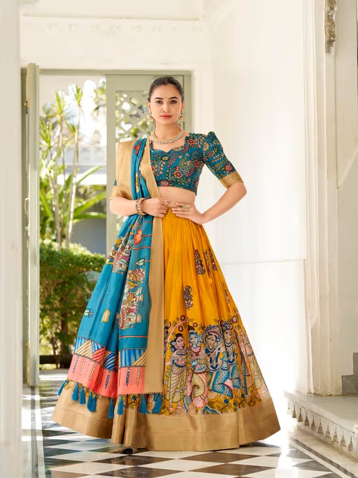 Yellow Dola Kalamkari Print Lehenga with Unstitched Choli and Dupatta