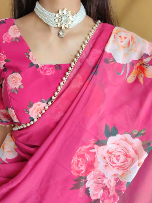 Step into grace with this LooknBook Art Hot Pink Georgette Floral Printed Pearl Lace Border Saree with Unstitched Blouse. LooknBook Art ethnic sarees come with a blouse piece, which can be stitched according to your taste and preference, with this beautiful design and fabric, this saree will fetch you oodles of compliments and praise.