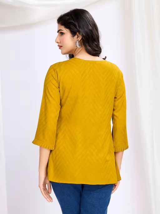 Introduce A Splash Of Elegance To Your Wardrobe with The Mojilaa Women's Mustard Pure Viscose Floral Embroidered A-Line Top. This Exquisite Piece Effortlessly Marries Classic Charm with Contemporary Flair, Ensuring You Stand Out At Every Occasion. Crafted From Luxuriant, Breathable Viscose, It Wraps You In Sublime Comfort While Offering A Flattering Drape That Accentuates Your Silhouette Beautifully.
