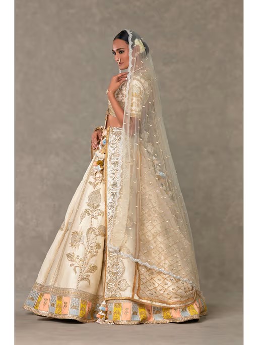 Lehenga- Lehenga adorned with embroidery with multi coloured resham, sitara & moti kaam |Contrast colour blocked border with embroidery and edged with kinari |Pocket detail | Side zip closure | Comes with a separate Can Can skirt Blouse- 'V' neckline | Elbow sleeves | Adorned with embroidery with multi coloured resham, sequins & moti kaam |Center back opening with tie-up tassel detail | Printed lining Dupatta- Organza dupatta embroidered with sequins |Embellished with embroidered borders and edged with jhallar |Printed backing |Tassel detail Trail- All over pearl cheent | Pearl Madakal finish