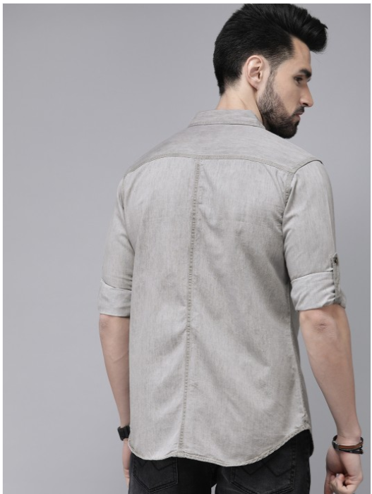 Grey solid Casual shirt ,has a spread collar, button placket, 2 patch pocket, long roll-up sleeves, curved hem