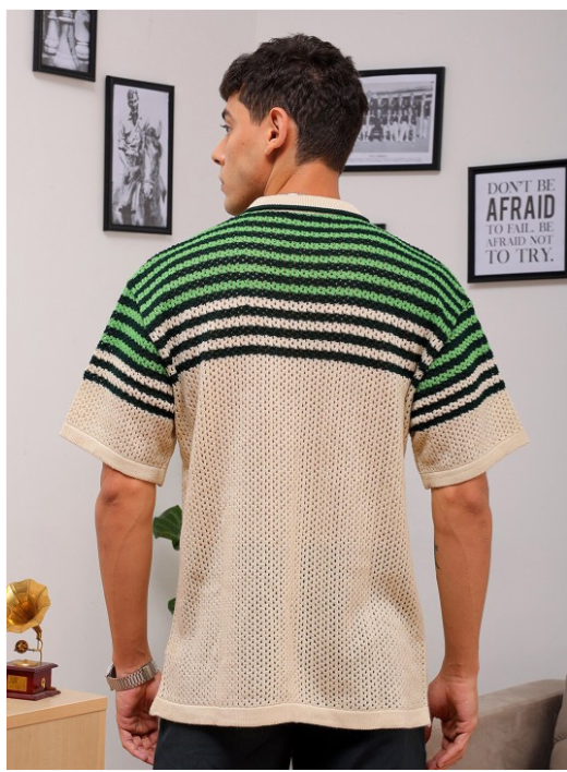 White, green & black striped opaque Casual shirt ,has a spread collar, button placket, short regular sleeves, curved hem