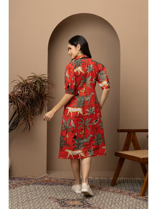 The Jungle Red Printed Cotton Midi Dress brings a bold, vibrant touch to your wardrobe with its eye-catching jungle print and comfortable, breathable 100% cotton fabric. Perfect for casual outings, summer days, or weekend getaways, this midi dress offers a relaxed yet stylish fit. The flattering midi length and unique print make it ideal for those who love a mix of boho chic and tropical fashion.