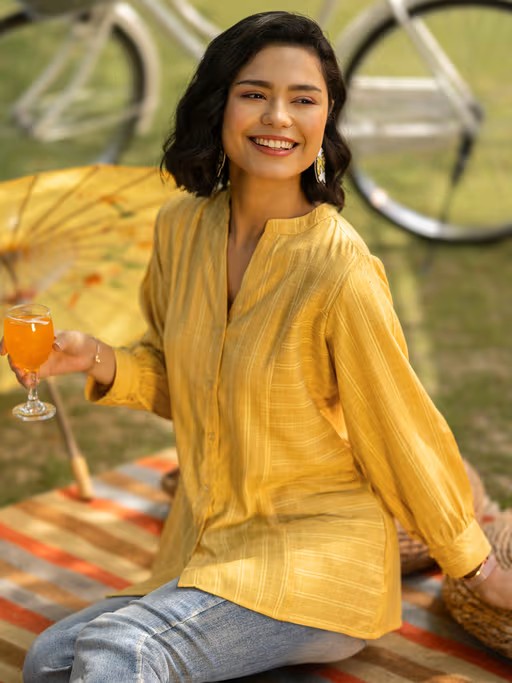 Elevate Your Ethnic Wear Wardrobe With Libas Women Yellow Woven Kurti. It Features Full Sleeves And Mandarin Neck Style. It Is Crafted From The Finest Material. This Outfit Is Ideal For Daily Wear Or Casual Outings With Friends And Family. Pair It With Matching Or Contrasting Pants, Or Choose A Palazzo. Finish The Look With Trendy Footwear.