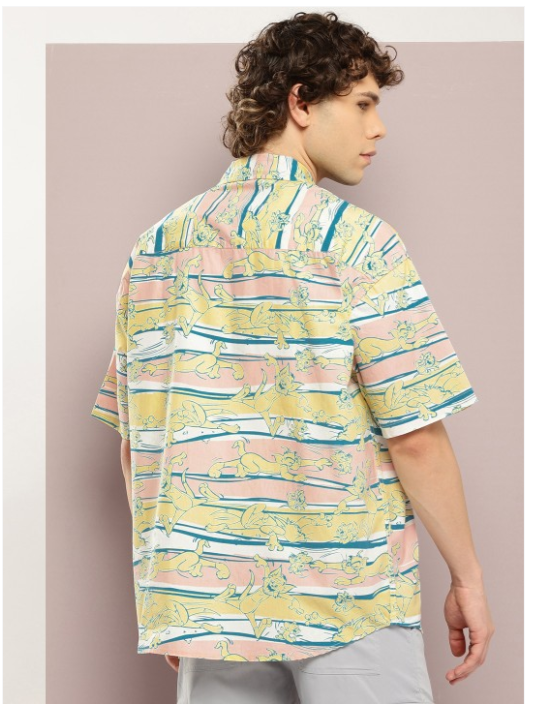 Pink, beige & blue Tom & Jerry graphic printed opaque casual shirt, features a Cuban collar, button placket, short drop-shoulder sleeves, and a curved hem.