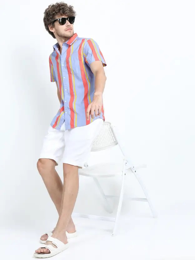 Men Slim Fit Striped Cut Away Collar Casual Shirt