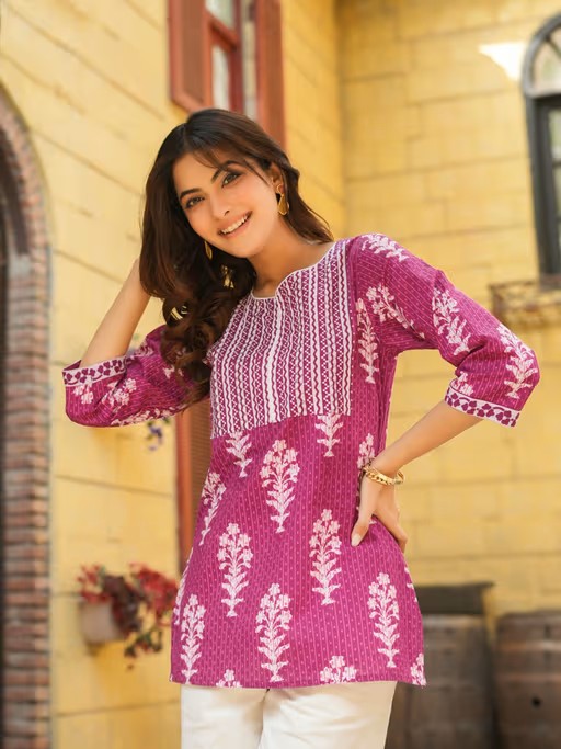Look Like A Diva In This Blue Kurta From Jaipur Kurti. Crafted From Cotton, This Beautiful Piece Is Finished With Half Sleeves And A Mandarin Neck. Complete The Look With Matching Bottoms And Heels.