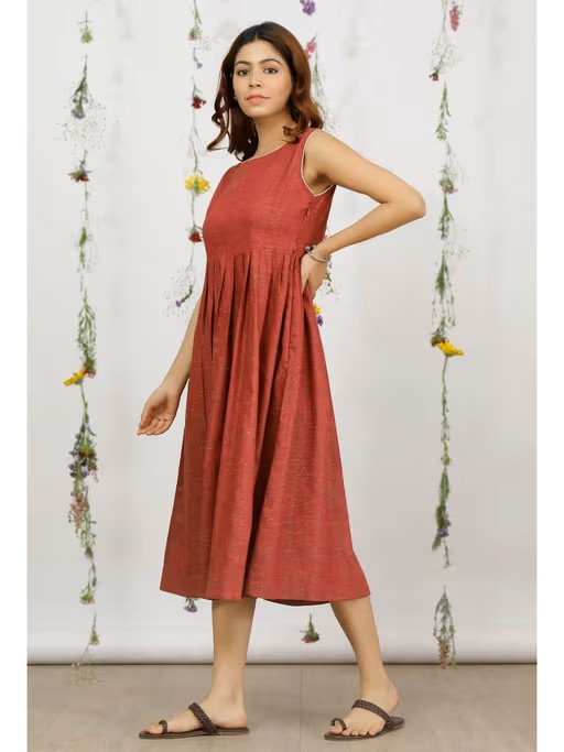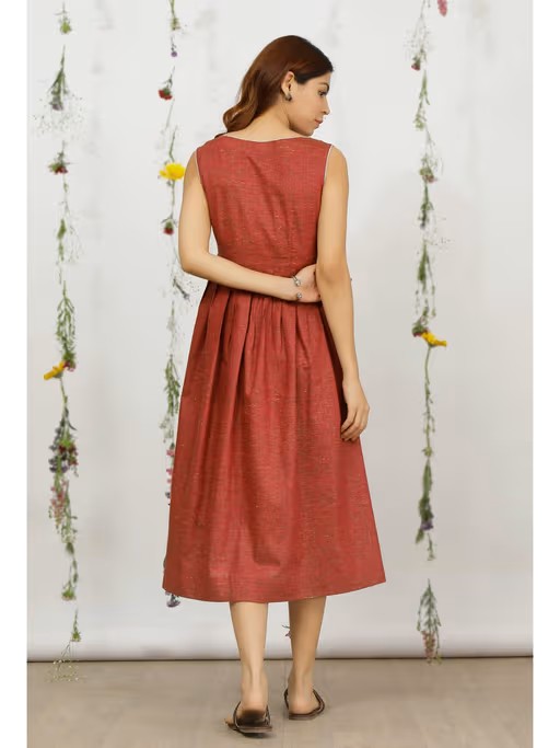 Carmine Red Khadi Cotton Sleeveless Flared Dress