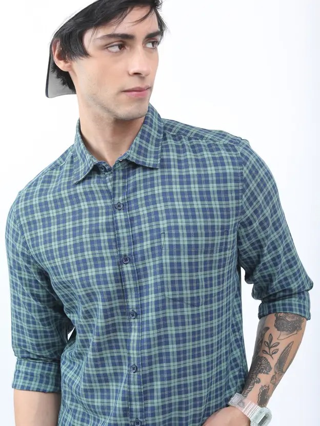 Men Slim Fit Checkered Cut Away Collar Casual Shirt